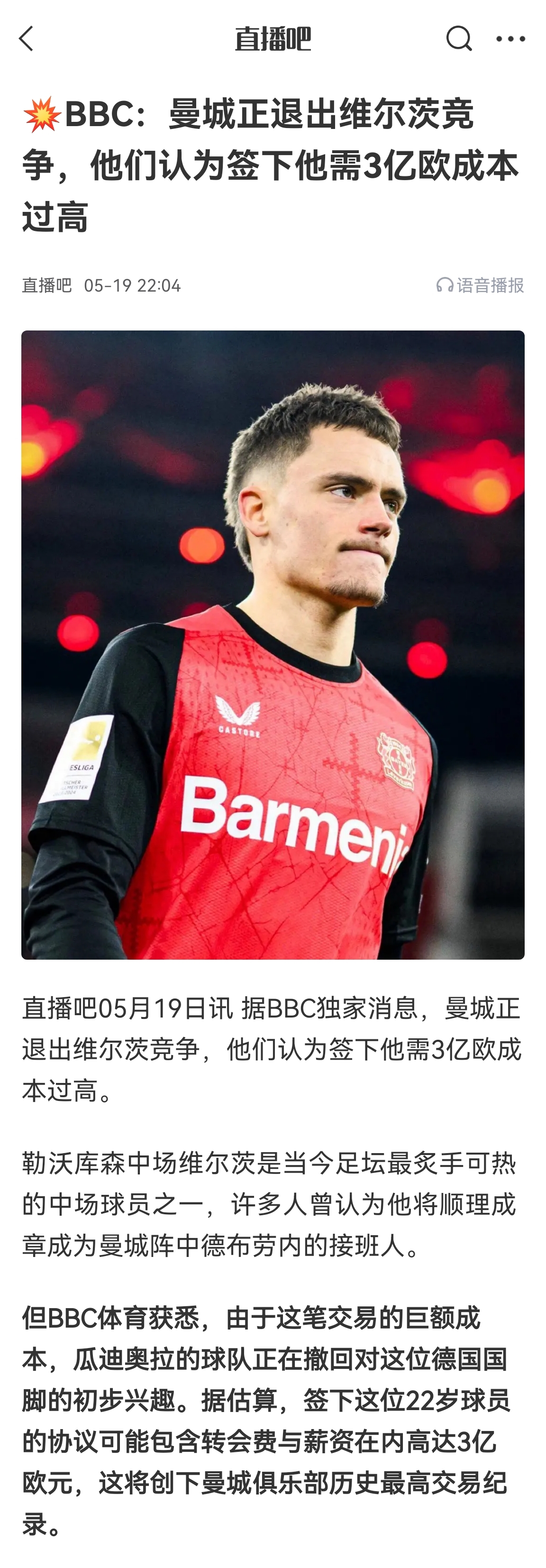 此前曼城一度介入维尔茨的转会,但最终因为转会费+工资总投入太高而退出。