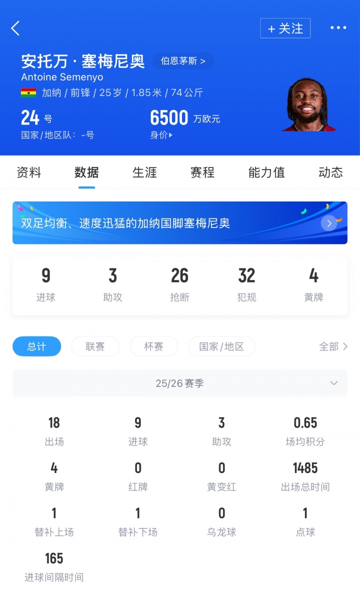 塞梅尼奥现年25岁,加纳前锋。本赛季他为伯恩茅斯出战18场,取得9粒进球和3次助攻,目前其德转身价为6500万欧。